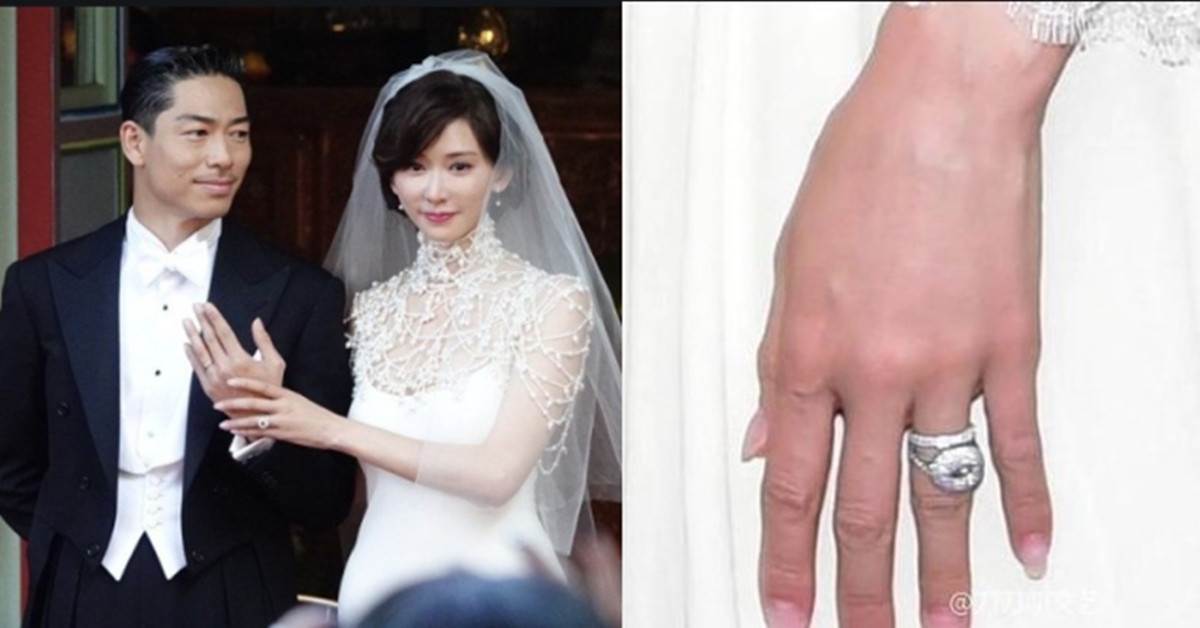 高領婚紗典雅珍珠點綴 林志玲超大鑽戒曝光