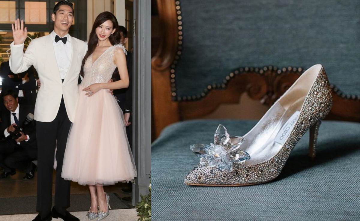 林志玲選穿Jimmy Choo灰姑娘玻璃鞋出席婚禮晚宴,約15萬7,800元。林志玲一出場引千人暴動